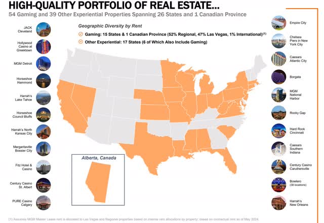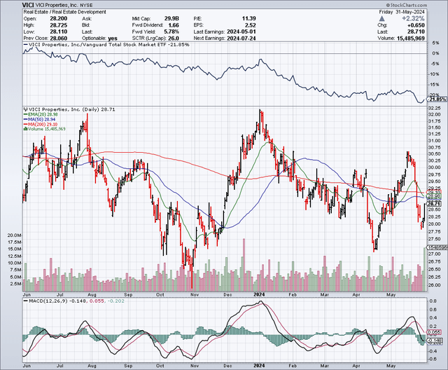 If money market yields drop by about 40%, to the low 3% range, I believe VICI Properties shares could support a yield around 4% to 4.5%; this means the valuation could be re-rated to a higher level. Based on an annual dividend of $1.66 per share, a yield of 4% implies a share price of about $40. I think this calculation is conservative and it is based on the current premium, whereby VICI Properties now yields less than 1% more than a typical money market yield of just over 5%. In my projections, I am suggesting a future premium of about 1% to 1.5% over money market yields, which is more than the current premium. Therefore, investors that buy this stock now at around $29 per share could be poised to see capital gains of nearly 40% between now and the end of 2026, plus collect the (locked in) yield of nearly 6%, which means total returns could approach 50% in the next couple of years or about 25% on an annualized basis.