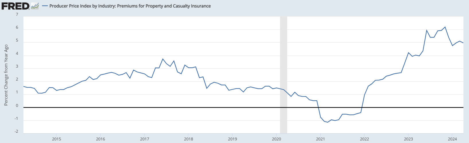 As a reminder, a combined ratio of 100 means an insurance company’s underwriting unit is breaking even; it pays out as much as it earns in premiums. I view 85-90% as a healthy combined ratio for a niche insurer like WRB, and it is operating safely in this range. In 2021-2022, insurance companies saw underwriting profits get squeezed as underlying inflation increased the cost of claims. With premiums often set annually, it took time for insurers to recoup pricing, and WRB now has, which is why it has seen underwriting profit recover so meaningfully. As you can see, P&C premiums have accelerated sharply since 2021. While a bit off the peak, they are still running up 5%. That is faster than overall inflation, which means insurance margins should stay buoyant and potentially rise further this year.