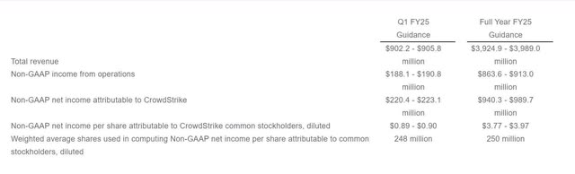 The following shows CrowdStrike’s guidance for the first quarter of FY 2025. Let’s compare guidance with the company’s actual results.