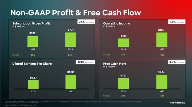First quarter FY 2025 non-GAAP subscription gross margins remained flat year-over-year at 80%, below its long-term target of 82 to 85%. GAAP gross margins also remained flat over the previous year’s comparable quarter at 78%. In the first quarter of FY 2025, non-GAAP income from operations grew around 71% year-over-year to reach $198.7 million, beating company guidance. Non-GAAP operating margin was 21.6%, up 490 basis points (“bps”) from the previous year’s comparable quarter. These numbers are excellent as CrowdStrike continues progressing towards its long-term non-GAAP operating margin target of 28% to 32%.