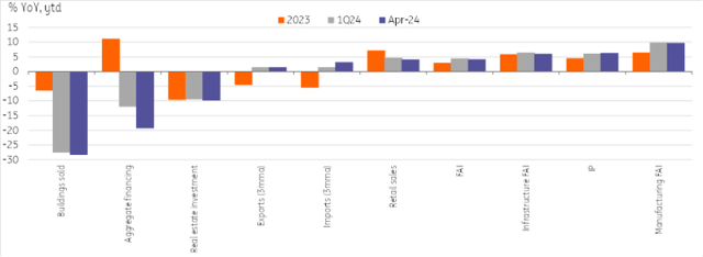 Fixed asset investment also disappointed on the month, falling to 4.2% YoY year-to-date largely due to a drag from private sector investment, which grew a tepid 0.3% YoY YTD. With property prices seeing a sharp decline in April and developer sentiment breaking new lows, it was unsurprising to see that real estate investment remained a major overhang at -9.8% YoY YTD.