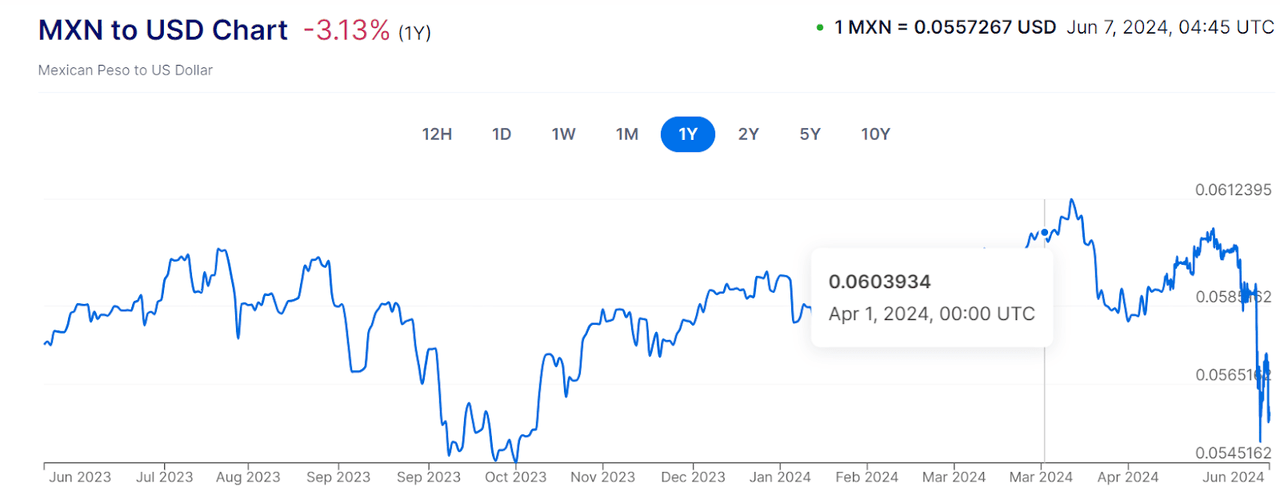 The headwinds I mentioned in my last article still persist, but I do see them dissipating over the year ahead. One example of this is the weaker $MXN-USD exchange rate that’s likely to have taken a chunk out of Q2 revenues that will be announced next month, but forecasters are predicting a bounceback to $MXN 17 per USD, with the sudden decline being attributed to a surprise landslide win in the Mexican elections. There are also other factors that could help the peso strengthen against the dollar even further, such as the carry trade or FX carry trade advantage that Mexico still has over the U.S. with its 5% higher interest rates, at about the 11% benchmarked by the Bank of Mexico in May 2024. Inflation is still high in Mexico, so we could see a prolonged period of higher interest rates and a strong spread with U.S. benchmark interest rates.