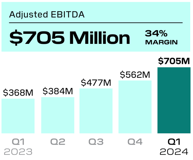 It is especially the Cash App that is driving Block’s adjusted EBITDA gains in recent quarters. In Q1’24, the Fintech saw 92% year-over-year EBITDA growth to $705M, as well as significantly expanding EBITDA margins. In the previous quarter, Block reported an adjusted EBITDA margin of only 24%, so the Fintech generated a 10 PP Q/Q gain in its most important metric.