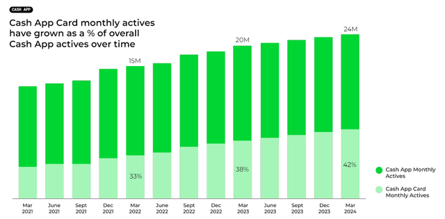 A key product for Block is the Cash App Card, which is a customizable debit card that can be used both online and in stores. The Cash App Card is connected to the Cash App and therefore allows for easy, instant money transfers something that especially younger users value. This financial product is seeing consistent growth and currently has 24M actives and growing usage as well.