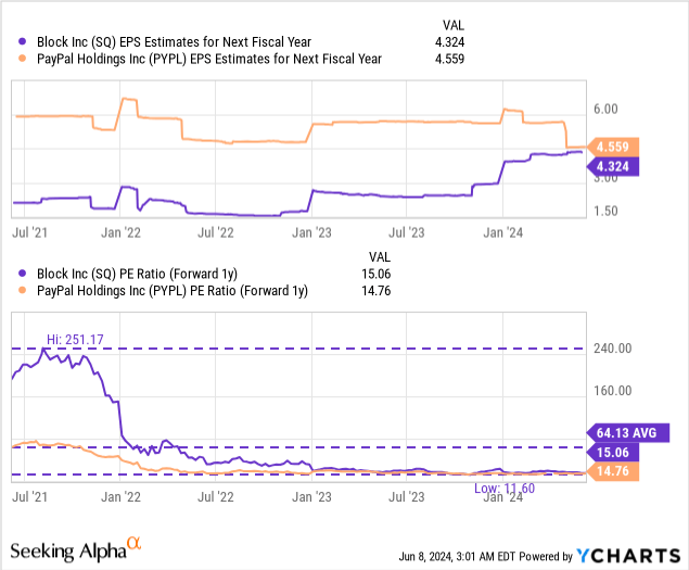 The good news about Block is that the Fintech is already profitable, not only on an adjusted EBITDA basis, but also based off of net income. Therefore, Block can be valued by using a traditional price-to-earnings ratio. The Fintech is currently valued at a price-to-earnings ratio of 15.1X which compares, as an example, to a P/E ratio of 14.8X for PayPal which is a key rival for Block in the Fintech space. Both Block and PayPal have traded at significantly higher P/E ratios in the past, especially during the pandemic, and Block is currently priced way below its longer term (3-year) average P/E ratio of 64.1X. PayPal’s 3-year average P/E ratio is 25.8X, so both PayPal and Block are trading significantly below their historical valuation averages. In the case of PayPal, I believe this valuation draw-down is a bit more deserved, but Block is executing well and growing much more quickly: Block is looking at annual EPS growth rates north of 20% (until FY 2027).