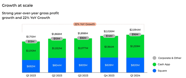 In the past, I indicated that Block had considerable potential in the Fintech space due to the company aggressively scaling its Cash App, which was essentially where all the momentum is for Block. In the last quarter, Q1’24, Cash App gross profits grew 25% year over year to a record $1.26B while Square, which includes the Fintech’s point-of-sale payment services, saw 19% year-over-year growth to $820M. While both segments clearly have momentum due to growing users (in Cash App) and growing product adoption (Square), Cash App remains the fastest-growing and most important business segment for Block, and this is unlikely to change in the future.