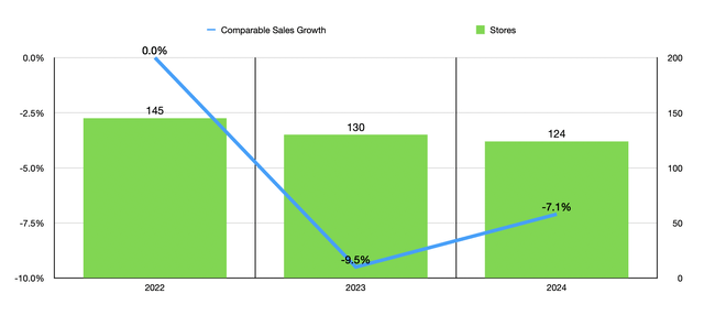 Over the past few years now, financial performance achieved by Vera Bradley has been mixed. Revenue dropped from $540.5 million in 2022 to $500 million in 2023. By 2024, revenue had fallen further to $470.8 million. This pain was driven by two factors. First, the number of locations that the company has in operation fell during this time from 145 to 124. In addition to this, comparable store sales have fallen in two of the past three years. In 2023, the sales decline was 9.5%. And in 2024, it was 7.1%. Combined, this is an aggregate comparable store sales drop of 15.9%.