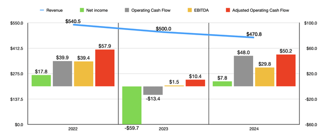When it comes to the 2025 fiscal year in its entirety, management expects revenue to remain range bound. They expect overall sales of between $460 million and $480 million. Operating cash flow is expected to fall to between $22 million and $24 million. But that very well could be because of working capital changes as opposed to other operational changes. Net income, meanwhile, should shoot up to between $16.3 million and $19.2 million. Given the uncertainty regarding these metrics, I think valuing the company based on 2023 and 2024 data would be more sensible.