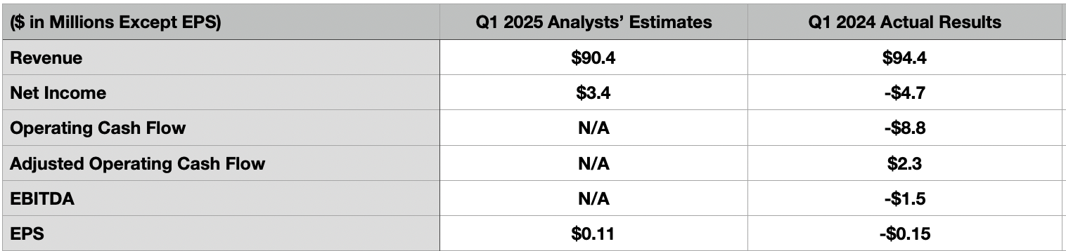 Of course, the picture can always change. And as I mentioned at the start of this article, management is expected to announce financial results for the first quarter of the 2025 fiscal year before the market opens on June 12th. The current expectation that analysts have is for revenue to total about $90.4 million. If this turns out to be correct, it would imply a year-over-year decline of 4.2% compared to the $94.4 million reported in the first quarter of 2024. Even though revenue is expected to fall, profits are expected to rise. Earnings per share should come in at around $0.11. That’s well above the $0.15 per share loss generated for the first quarter of 2024. This would translate to net income of $3.4 million, compared to the $4.7 million loss reported last year. Analysts have not provided estimates when it comes to other profitability metrics. But in the table below, you can see what some of these were for the first quarter of last year. In all likelihood, these should also improve.