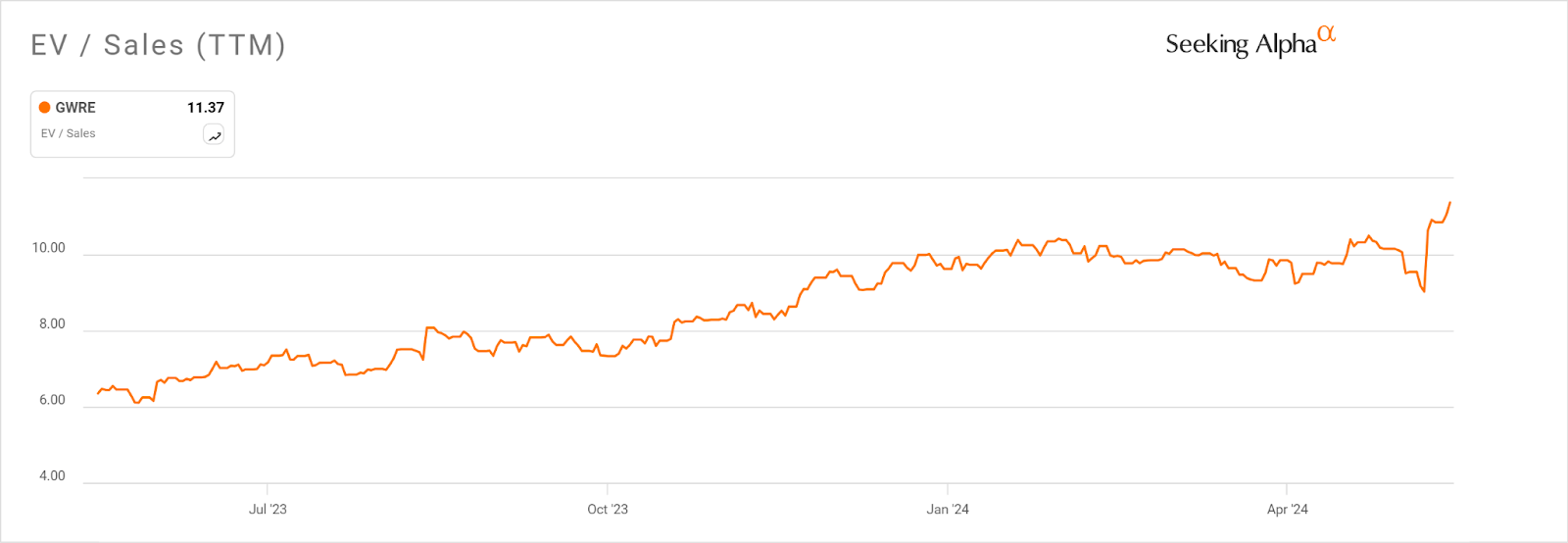 Furthermore, GWRE’s EV/Sales multiple has almost doubled in the past year, as the Seeking Alpha chart shows here: