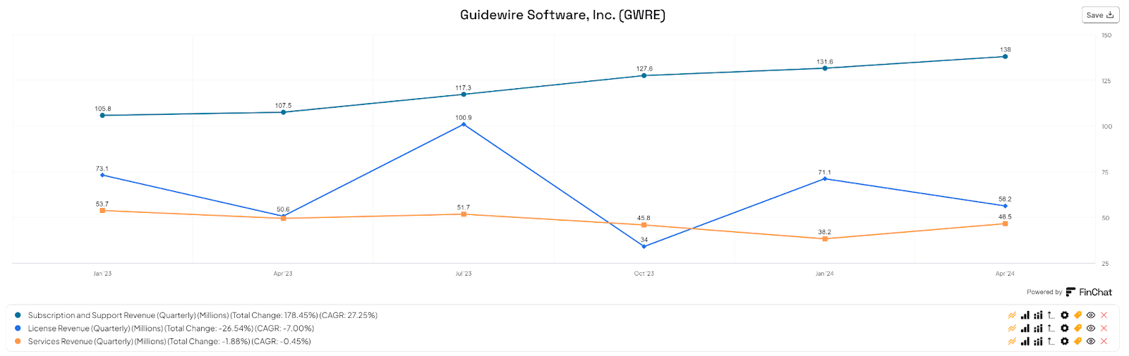 For balance sheet results, GWRE ended the quarter with $782.3 million in cash, equivalents and short-term investments and $398.5 million in total debt, all of which is due in less than 12 months (current portion).