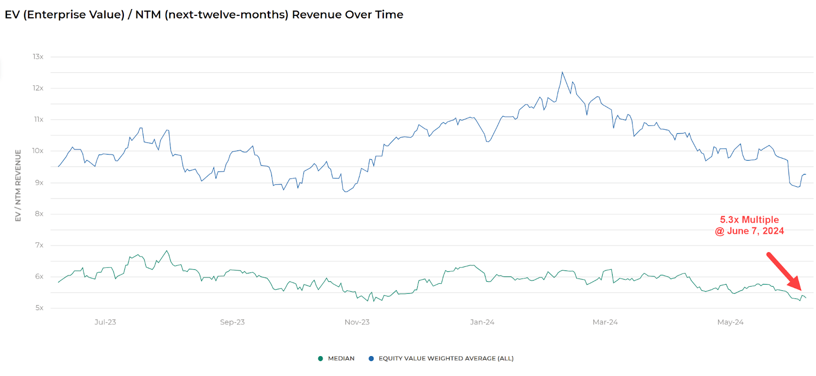 The Meritech Capital Index of publicly held SaaS application software companies showed a forward EV/Revenue multiple median of around 5.3x on June 7, 2024, as the chart shows here: