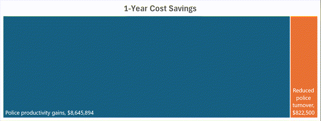 - 25% reduction in police turnover, with the current US police turnover rate standing at 14% (savings based on $100,000 ramp-up cost for each new police officer)