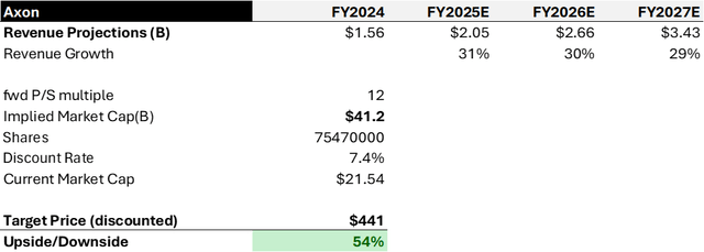 With Axon’s TAM expanded another $8 billion, we expect the revenue to sustain its strong momentum for the next three years. The company is guiding $1.95 billion revenue for FY 2024. However, we believe management is being conservative, as we estimate it will deliver around $2.05 billion for the full year (31% growth). Historically, Axon has consistently beaten guidance by 3% to 5%. Our revenue growth projections are 30% for FY 2026 and 29% for FY 2027 due to continuous TAM expansion.