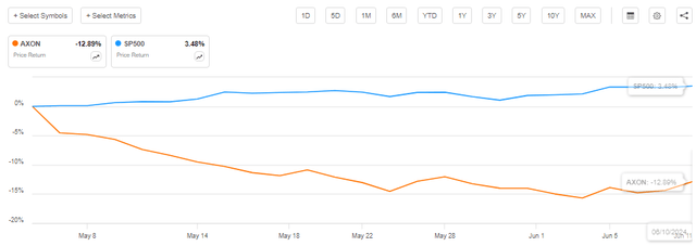 Axon Enterprise, Inc. (NASDAQ:AXON) reported its Q1 2024 results in May. Earnings were very strong as revenue increased 34% to $461 million and the company raised its 2024 guidance. Despite this strong performance, the stock experienced a 10% price correction in contrast with the S&P 500’s 3.5% increase during the same period.