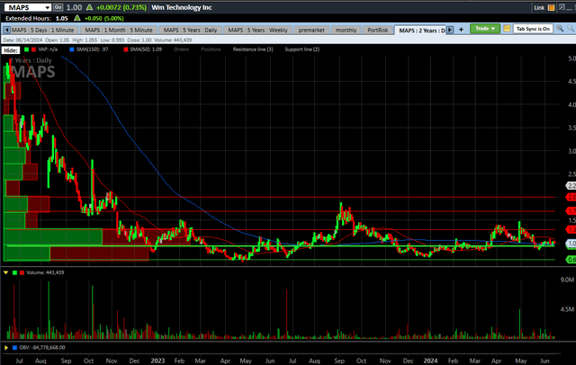 I think that $0.60 was a ridiculously low price and see support above there at $0.95. My read of the chart now suggests resistance potentially at $1.30 and $1.70. My third resistance of $2.00 would be a new high for post-2022 but still down a lot from the SPAC price.