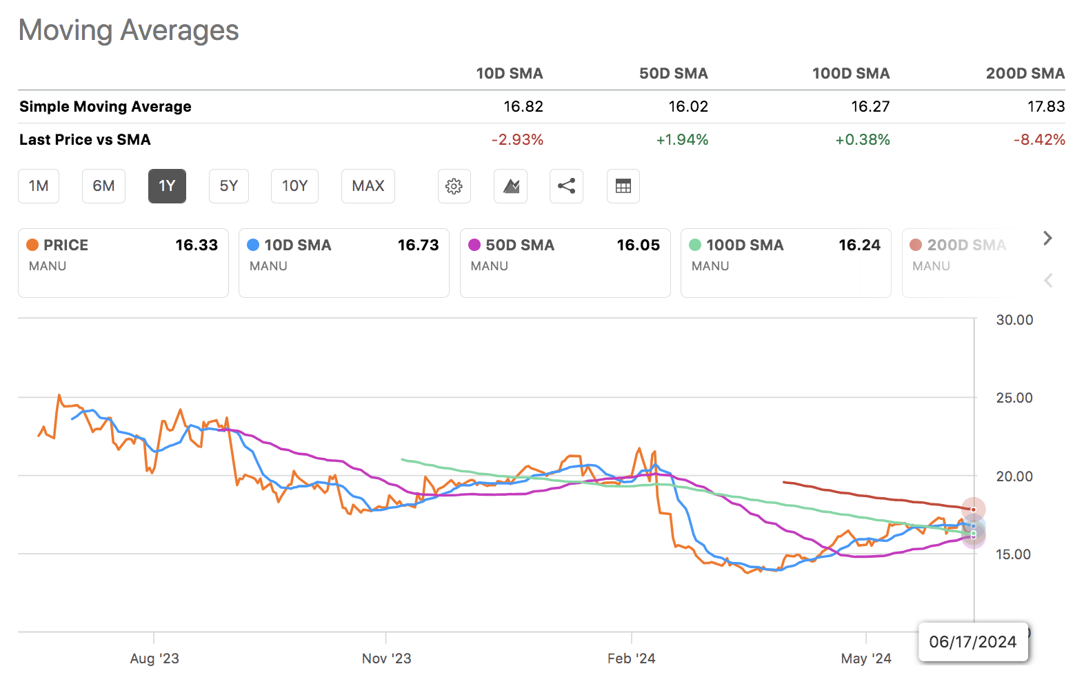 A look at Manchester United’s stock’s technical features shows that it is trading above its 50- and 100-day moving averages but below its 10- and 200-day moving averages. Moreover, the stock’s RSI of 47.3x is near its midpoint, suggesting little conviction exists from either buyers or sellers.
