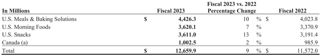 Within this segment, we see that over $4.4 billion comes from U.S. Meals & Baking Solutions. This means this business unit contributes to almost 22% of General Mills’ total sales and to almost 32% of North America Retail sales.