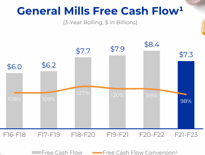 This leads to a second important aspect many investors like about General Mills: its free cash flow generation. As we can see, General Mills’ three-year rolling FCF conversion rate is usually above 100%, with peaks of 127% and lows of 98%. This is why General Mills has a long track record of paid dividends.