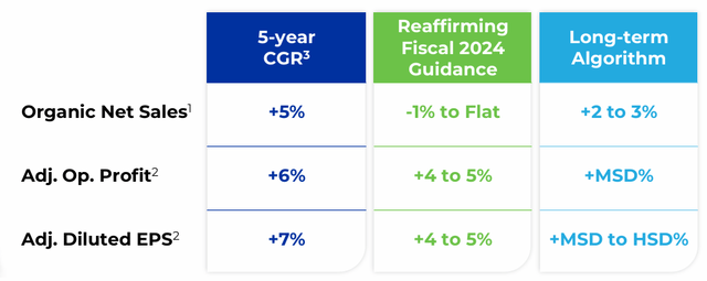 General Mills is a mature business and, as such, it can be rightly classified as a cash cow in the BCG growth-share matrix: low growth and high share represent most of General Mills’ products. As such, it is a company that can be milked for cash. We see General Mills’ overview reflects this: over the past five years, its net sales grew 5% annually while EPS grew around 7% per year. At the same time, going forward, General Mills expects milder growth. This fiscal year should see net sales flat or slightly negative, while long-term the company targets a 2% to 3% net sales growth, with operating profit margin expected to grow in the mid-single-digits and the company’s adj. EPS to compound mid-to-high-single digits.