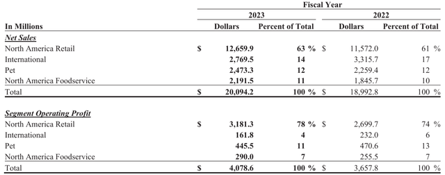 Per its 2023 Annual Report, the company has four operating segments: North America Retail; International; Pet; and North America Foodservice.