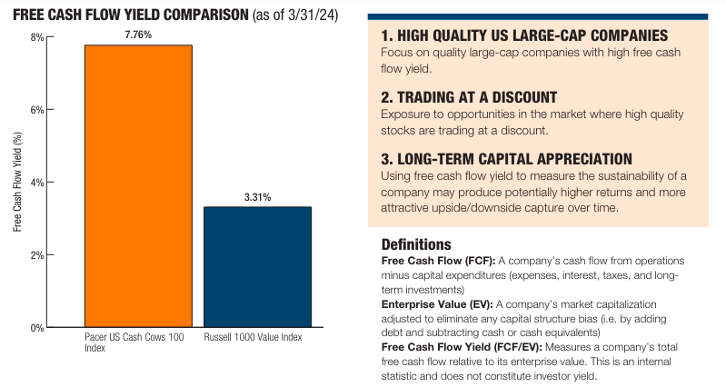 COWZ tracks the Pacer US Cash Cows 100 Index, selecting 100 stocks from the Russell 1000 Index based on their free cash flow yields. This single metric combines quality (free cash flow) and value (enterprise value), resulting in a substantially different portfolio than Pacer’s preferred benchmark, the Russell 1000 Value Index.