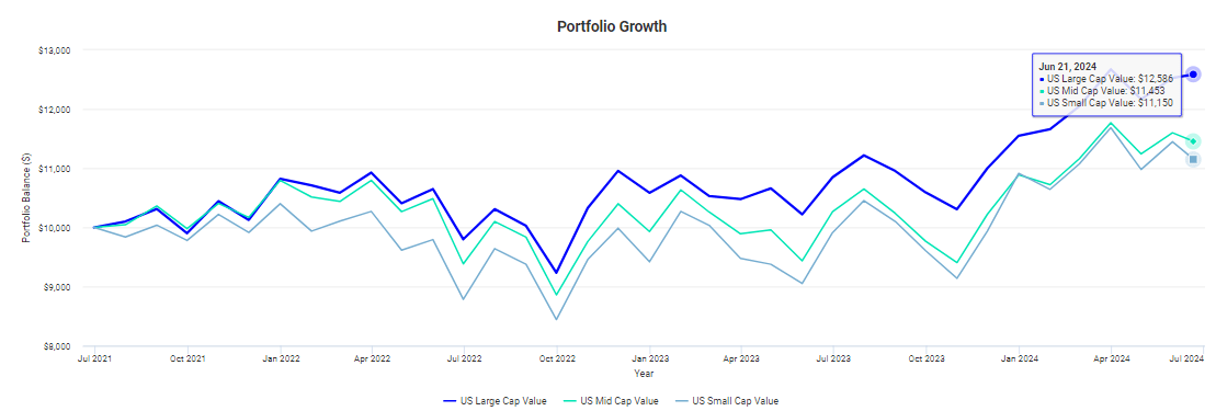 This trend makes sense based on recent returns of value stocks. As shown below, small- and mid-cap value stocks have significantly trailed large-cap value stocks over the last three years. As a result, they’re more likely to have strong value characteristics and be selected by rules-based funds, provided they are in the selection universe.