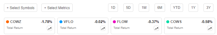 COWZ has struggled since my March review, where I noted its deep-value, low-growth approach could either pay off handsomely or perform terribly. As shown below, COWZ delivered a -1.78% total return since March 16, 2024, slightly worse than other free-cash-flow funds like VFLO, FLOW, and COWS.