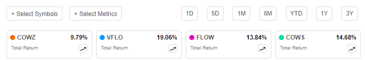Since COWS launched on September 12, 2023, COWZ has lagged all these peers by 4-9%.