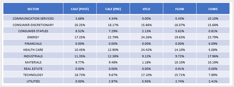 Before I evaluate COWZ’s fundamentals, I want to highlight its sector exposures, both post- and pre-reconstitution. The table below highlights how COWZ has the least exposure to Energy stocks relative to its peers. The offset is a 19% allocation to Technology stocks, the highest since I began coverage.