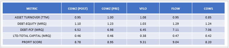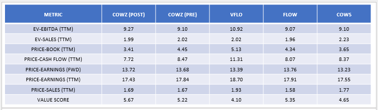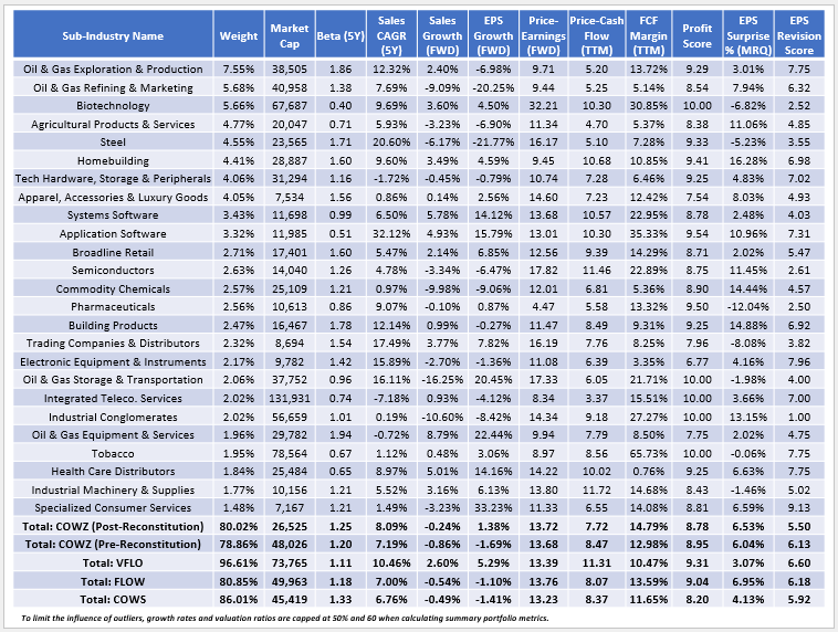 The following table highlights selected fundamental metrics for COWZ’s top 25 sub-industries, which total 80.02% of the portfolio. I’ve also included summary metrics for COWZ’s portfolio pre-reconstitution and metrics for VFLO, FLOW, and COWS at the bottom.