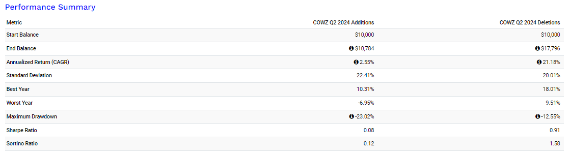 1. Smaller companies typically mean greater volatility, evidenced by COWZ’s five-year beta increasing from 1.20 to 1.25. Oil & Gas Exploration & Production is still the top sub-industry but gone at Integrated Oil & Gas stocks (XOM, CVX), which are historically less volatile than their sector peers. For more color, consider the three-year performance summary for COWZ’s additions vs. deletions (link here), showing COWZ’s additions to be more volatile (standard deviation) with a larger 23.02% maximum drawdown.
