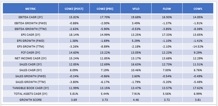 4. COWZ’s estimated sales and earnings per share growth rates slightly improved, but like most deep-value funds, they remain virtually flat. Excluding Energy and Materials, two sectors highly influenced by changes in commodity prices, COWZ’s growth rates are 1.07% and 5.23%, so it’s a little better but still not as good as VFLO. Consider these additional growth metrics below, which show COWZ’s 3.69/10 sector-adjusted growth score well below VFLO.