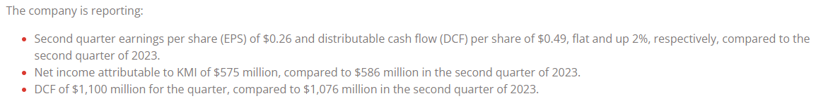 Kinder Morgan reported its 2Q 2024 results with $0.26 / share in EPS (P/E of 20 annualized) and DCF per share, putting the company at a 10% yield.