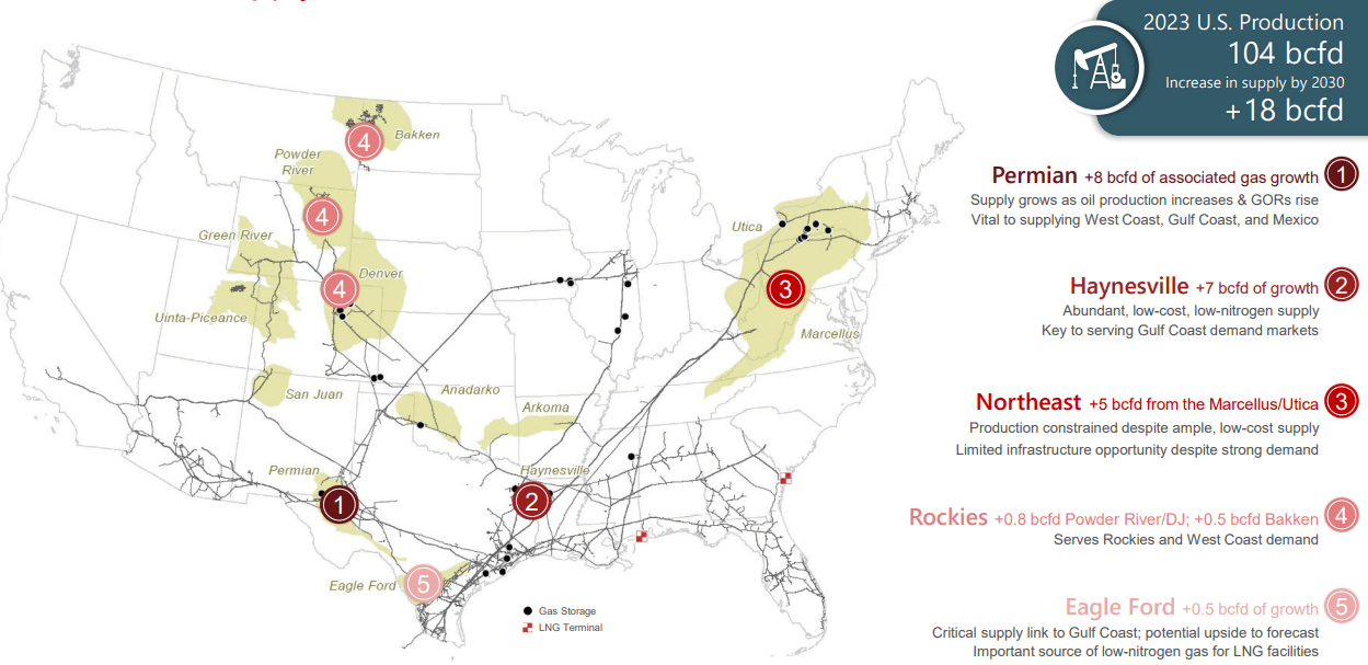 Overall 2023 U.S. production was a massive 104 billion cubic feet / day and supply is expected to expand by 18 billion cubic feet / day by 2030. That’s almost 20% growth over the next 6 years. That growth will come from a variety of basins, but a common theme for all of these basins is the largest distance between them and LNG exports or population centers.