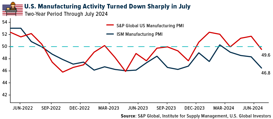 The JPMorgan Global Manufacturing PMI also entered contraction territory in July, registering a 49.7 and dipping below its three-month moving average.