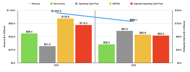 However, comparable store sales plummeted 18.4%. That compares to the 3.4% improvement in comparable store sales seen from 2021 to 2022. The drop in revenue brought with it declining profits and cash flows. The one exception to this was operating cash flow, which nearly doubled from $51 million to $97.2 million. But once we adjust for changes in working capital, we get a drop from $115.2 million to $83 million. This overall trend is disconcerting to say the least.