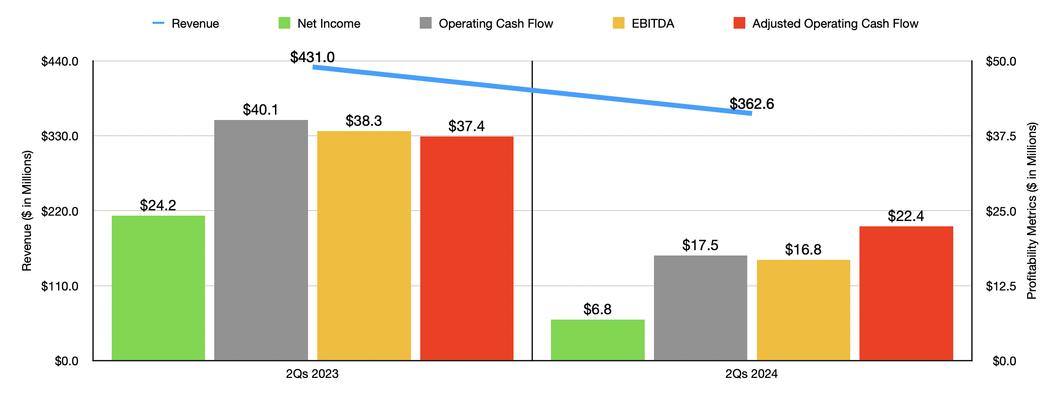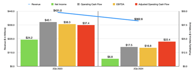 This kind of space is low margin in nature. And when revenues contract, especially because of a decline in comparable store sales, margin contraction is the raw as opposed to the exception. And that is exactly what we can see here. Net income in the first half of 2024 was a paltry $6.8 million. That was well below the $24.2 million reported the same time one year earlier. All other profitability metrics followed net profits lower as well. Operating cash flow was cut by more than half, from $40.1 million to $17.5 million. If we adjust for changes in working capital, we get a drop from $37.2 million to $22.4 million. And lastly, EBITDA for the business declined from $38.3 million to $16.8 million.