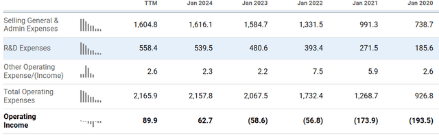 The company has almost no capital expenditure to worry about and has a levered free cash flow margin of almost 40%. Looking at the operating income, it has been improving greatly on an annual basis. However, the company is also spending heavily on research and development, so the cash picture could be even better.