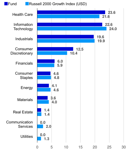 At the end of the second quarter, the fund’s largest absolute weights were in the health care, technology, industrials and consumer discretionary sectors. Relative to the Russell 2000 Growth Index, the fund was overweight in consumer discretionary and health care and underweight in communication services, technology and utilities. During the quarter, we added to the fund’s positions in health care and materials and reduced exposure in the technology, industrials and consumer discretionary sectors. In technology, we added Rambus (RMBS), Impinj (PI), SiTime (SITM), Nova and Itron (ITRI) and sold DoubleVerify (DV), Manhattan Associates (MANH), Blackline (BL), Freshworks (FRSH), Lattice Semiconductor (LSCC), Credo Technology (CRDO), Gitlab (GTLB) and Globant (GLOB). In health care, we added Vericel (VCEL), ADMA Biologics (ADMA), Integer (ITGR), Inspire Medical Systems (INSP), Encompass Health (EHC) and BioLife Solutions (BLFS) and sold Cytokinetics (CYTK), Shockwave Medical (SWAV) and Acadia Healthcare (ACHC). In industrials, we added FTAI Aviation (FTAI). In consumer discretionary, we added SharkNinja (SN) and sold On Holding (ONON). In consumer staples, we sold Grocery Outlet (GO). In energy, we sold ChampionX (CHX). In materials, we added ATI (ATI).