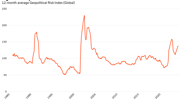 Importantly, this comes at a time when global markets are fraught with geopolitical risk. With a US election looming, unrest in the Middle East, and a prolonged military conflict in Eastern Europe, one would not be surprised to see the geopolitical risk index has seen a surge higher: