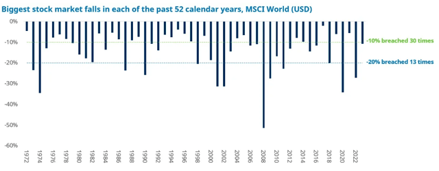 But we have to remember, what is going on right now is more normal than one might expect. During bull market runs, it is easy to forget that markets go up and down, and that is not an inherent problem when one has a long-term investment horizon. In fact, even 10% drops – as we have seen in the NASDAQ 100 – are quite common. Looking back at the last 52 calendar years, we have seen drops of 10% or more on 30 occasions: