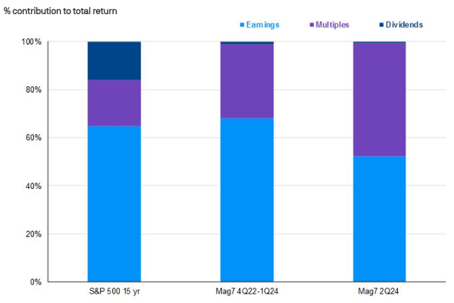 This is important because it underscores why one may want to be patient at this moment. Yes, stocks have taken a beating lately and may appear cheap in relative terms. But that is a very short-term view. If we look back further, we see that equity markets have been climbing for a while and investors have been “paying up” to own these names. The reality is that the Mag 7 has been a winning theme, and many investors have been playing catch-up to amplify their exposure to these names. We see this because multiple expansion was a significant source for total returns in the second quarter: