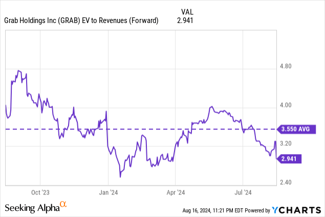 Another way to look is to examine the multiple the stock is currently trading at, and how much growth is baked into the stock. Grab is trading at nearly 3x forward EV/Sales, lower than the 1-year average of 3.6x. The consensus estimate is a 17% annual revenue growth in 2025, lower than our estimate of 19%, driven by robust Deliveries growth and foreign exchange headwinds winding down. Assuming the stock will trade at the same multiple next year, our estimated fair value is $3.9 per share (23% upside potential).