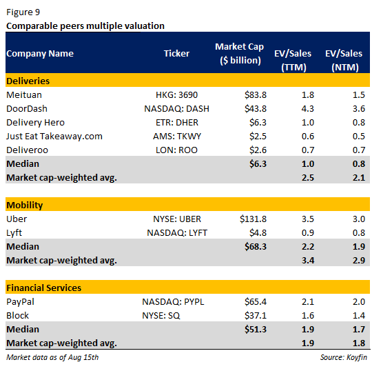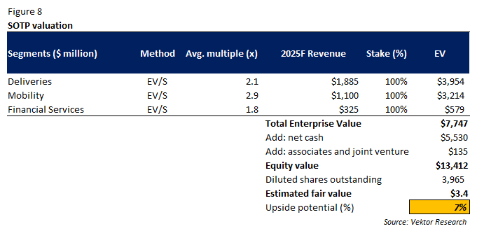 Our sum-of-the-parts valuation method suggests that Grab’s estimated fair value is $3.4 per share (7% upside), down from the previous estimated value of $3.6 per share. This implies a 2.3x 2025F forward EV/Sales.