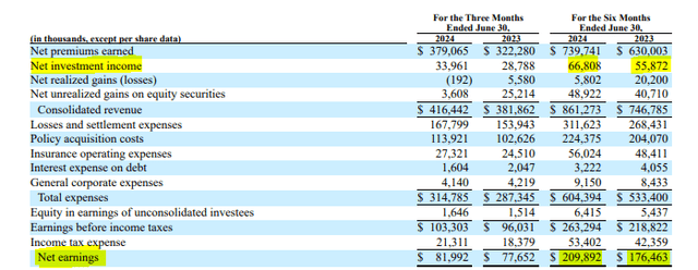 The three lines of business contributed to the underwriting income, all delivering a combined ratio below 100%. The largest earnings contributor was the property segment, which delivered an impressive 57.9% combined ratio on a year-to-date basis, generating $110.9 million in underwriting income.
