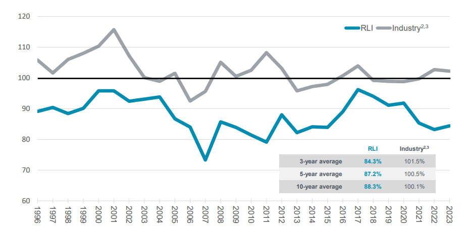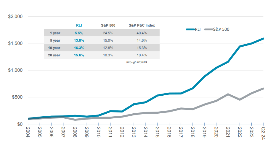 RLI has proven to be a resilient and outperforming insurer, offering property, casualty, and surety insurance coverages. Over the last 29 years, RLI has maintained a combined ratio below 100, surpassing the industry average by an average of 12 points over the past decade.