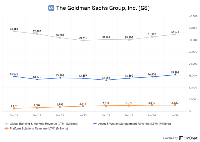 Next, the Asset & Wealth Management segment offers investment products to the general public and financing and investment solutions for wealth management clients. In addition, their consumer banking platform, Marcus, was consolidated within this segment together with the proprietary investments of the firm across different public and private assets (CIE).