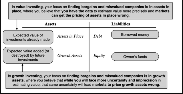Value investors believe that the best investment bargains are in mature companies, where assets in place (investments already made) are being underpriced by the market, whereas growth investors build their investment theses around the idea that it is growth assets where markets make mistakes. Finally, there are market players who try to make money from market frictions, by locking in market mispricing (with pure or near arbitrage).