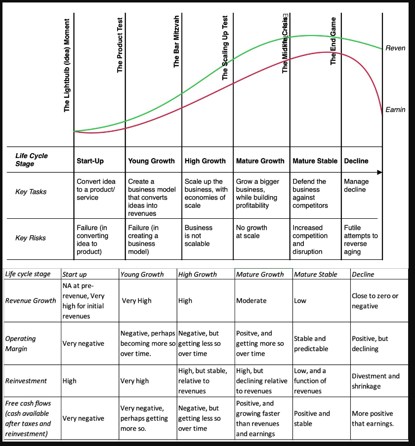 As I reveal my ignorance about TikTok trends, social media celebrities and Gen Z slang, my children are quick to point out my age, and I accept that reality, for the most part. I understand that I am too old to exercise without stretching first or eat a heaping plate of cheese fries and not suffer heartburn, but that does not stop me from trying occasionally. For the last decade or so, I have argued that businesses, like human beings, age, and struggle with aging, and that much of the dysfunction we observe in their decision-making stems from refusing to act their age. In fact, the business life cycle has become an integral part of the corporate finance, valuation and investing classes that I teach, and in many of the posts that I have written on this blog. In 2022, I decided that I had hit critical mass, in terms of corporate life cycle content, and that the material could be organized as a book. While the writing for the book was largely done by November 2022, publishing does have a long lead time, and the book, published by Penguin Random House, will be available on August 20, 2024, at a bookshop near you. If you are concerned that you are going to be hit with a sales pitch for that book, far from it! Rather than try to part you from your money, I thought I would give a compressed version of the book in this post, and for most of you, that will suffice.